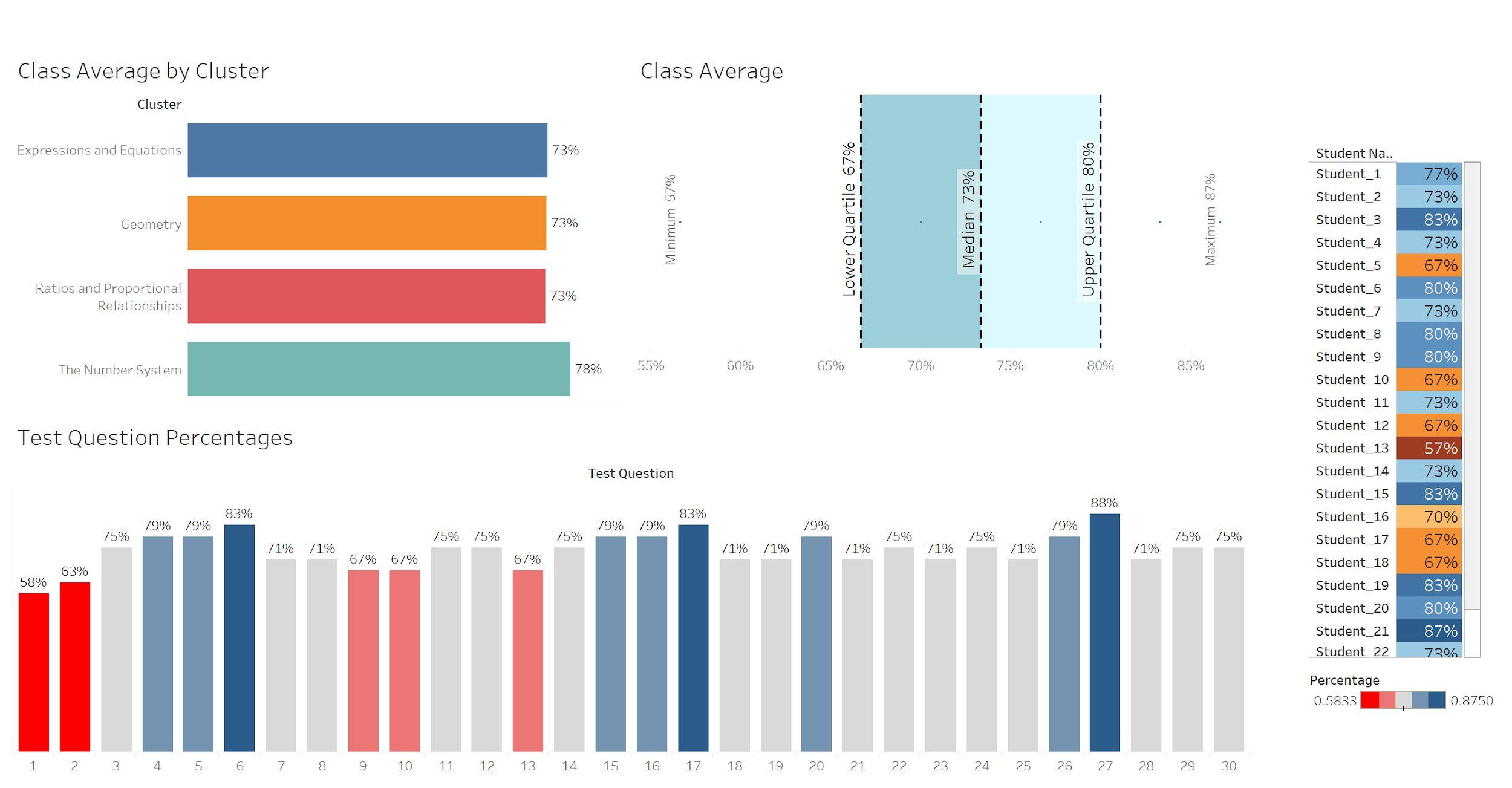 Project77 was engaged by a high performing middle and high school to help codify common core Math standard-aligned assessments and create a data visualization dashboard to empower teachers and school leaders to discover insights to support student learning. Project77 empowers organizations with data insights and services to help drive decisions. Founded by social entrepreneurs and leaders in the education space, we bring cross-sector solutions to our partners through our expertise in using data analytics to drive best practice. Math Standards Based Assessments Pro